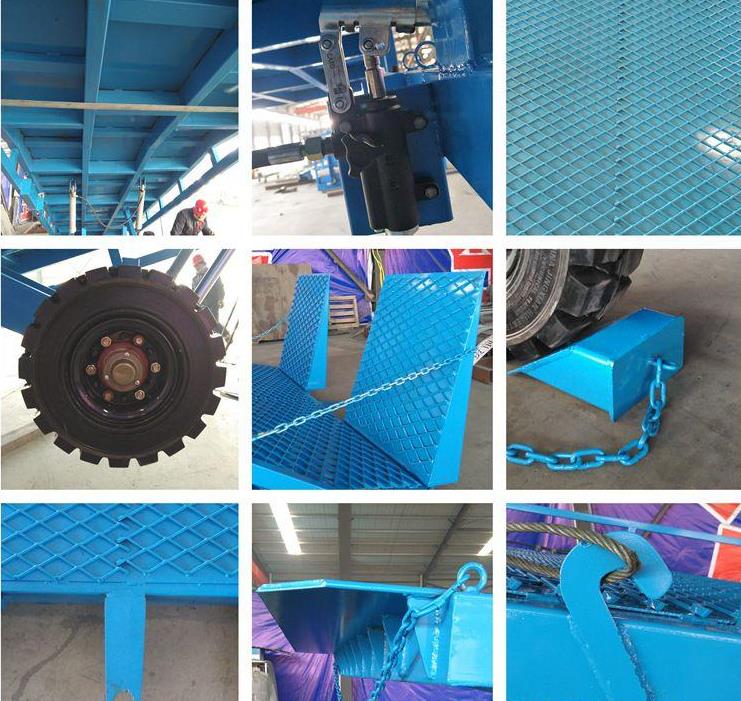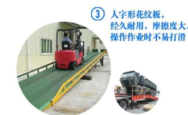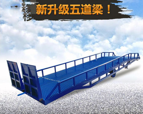 淄博登車橋-集裝箱登車橋-叉車搭橋-折疊式登車橋是與叉車配合使用的貨物裝卸輔助設備。有了它,叉車能直接從地面駛入汽車車廂內部進行批量裝缷作業。產品采用人工液壓動力,不需接動力電源,移動式登車橋坡面采用特制的高強度齒形鋼格板,具有的防滑性能,使叉車有更好的爬坡能力和操控性。即使在雨雪天,仍能保障正常作業。隨機配置的剎車墊,能有效防止叉車在登車橋上行走作業時,登車橋發生溜車及移動以保障作業安全。只需單人操作,即可實物的安全快速裝卸。