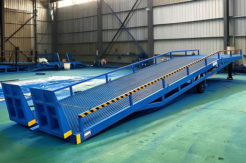 移動式登車橋(移動式裝卸貨平臺、集裝箱裝卸平臺)是與叉車配合使用的貨物裝卸輔助設備,可根據汽車車廂的高低調節高度,叉車可以直接通過本設備駛入車廂內部進行貨物的批量裝卸,僅需單人作業,即可實現貨物的快速裝卸。它使企業減少大量勞力,提高工作效率,獲取更大經濟效益。臺面采用特制的菱形網格板有可靠的強度,能保證長期使用而不變形。它的菱形網狀結構,充分保證了卓越的防滑性能,使叉車有更好的爬坡性和可操縱性。即使在雨、雪天氣,仍能保證正常使用。可調節長度的索鏈能方便地鉤住貨車,使移動式登車橋與貨車始終緊密貼合。采用手搖液壓泵作動力,勿需外接動力電源即可輕松實現登車橋的高度調節。配置的剎車墊可有效防止貨車裝卸時登車橋移位。